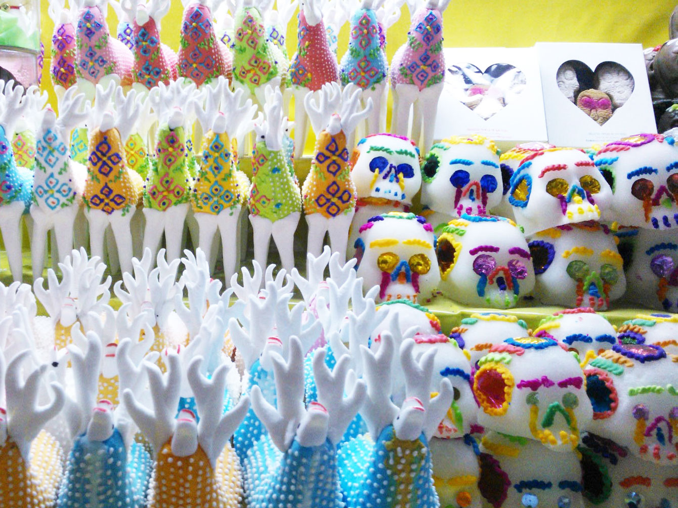 La semana pasada tuve la oportunidad de visitar el centro y disfrutar la “Feria del Alfeñique” en Toluca. Es una celebración tradicional que acompaña el Día de Muertos. La extraña palabra se refiere a la pasta de azúcar que sirve para hacer calaveritas y otras figuras como borregos, venados, ataudes, cruces, frutas y muchas otras que se han ido agregando a través de los años. Me encanta la combinación de colores y las formas tan creativas. Esta vez los venados verdaderamente llamaron mi atención, tienen un diseño tan bonito. Creo que ya sé en qué estará basado mi próximo amigurumi. También encontré un puesto con muchas figuras de la muerte practicando diversos oficios, un trabajo tan detallado y bello.