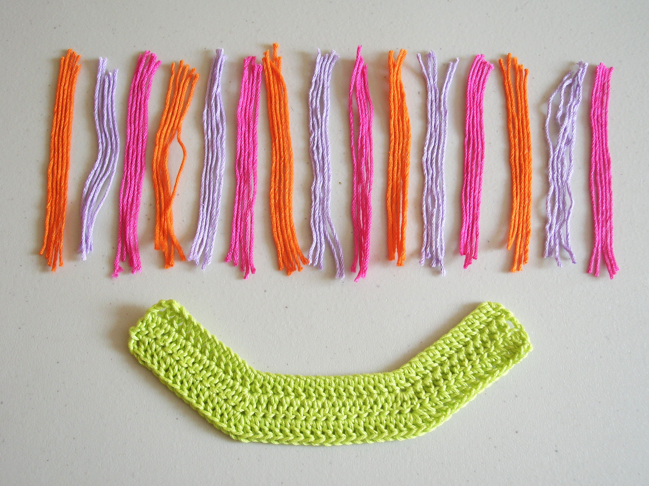When finished, cut 3.9″/ 10 cm strands of yarn for the fringes, 5 sets of 5 strings of each color, so there will be 15 sets in total.